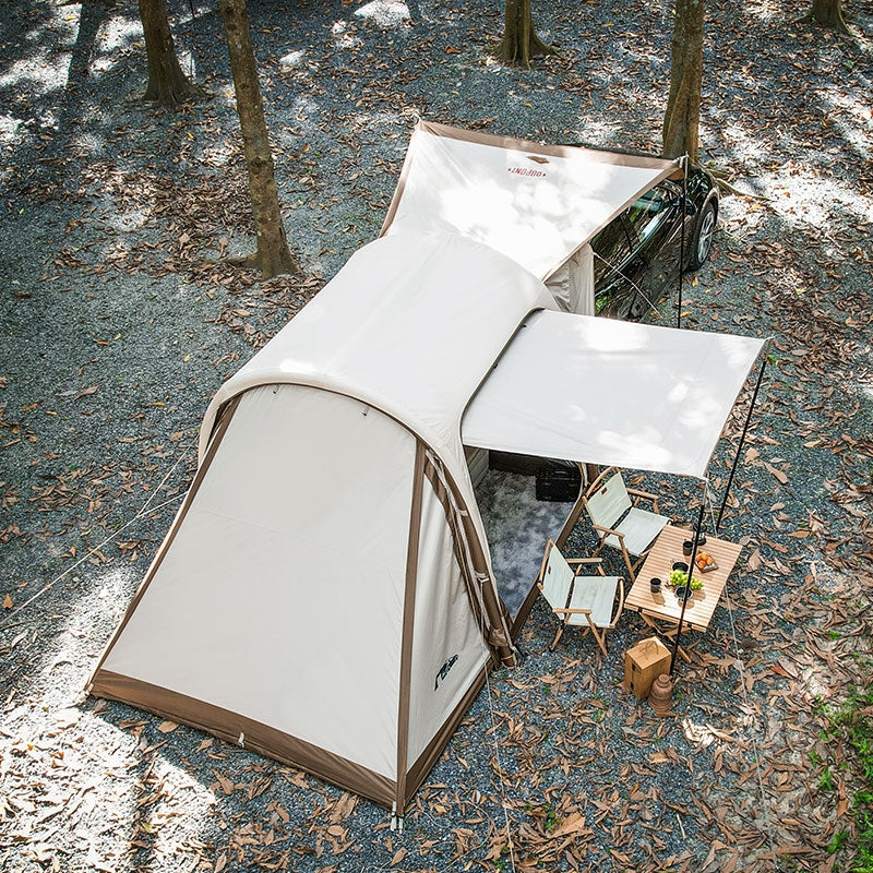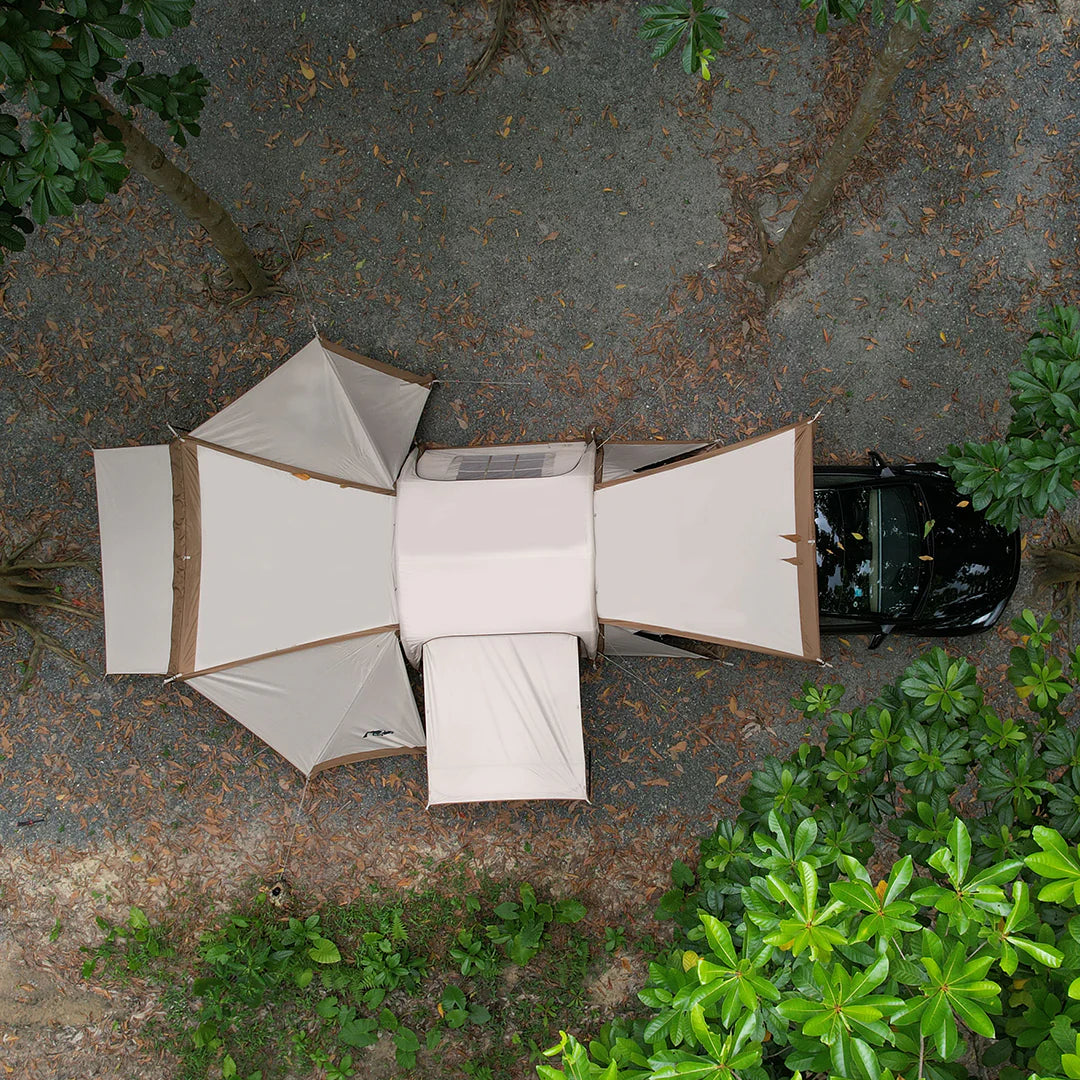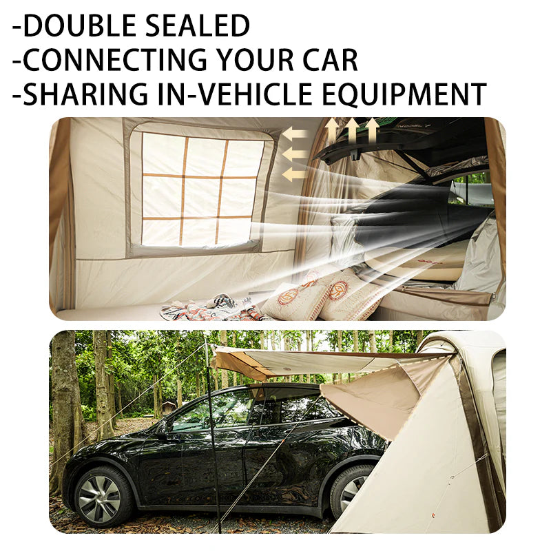 Die Zelte wurden speziell für den Einsatz im Freien entwickelt. Der Anschluss passt auf alle EVs, SUVs, Model X, Model Y und Familien-Elektroautos. Dank einer zuverlässigen Verbindungsmethode entsteht eine insektenfreie, wetterfeste Abdichtung. Es bietet schnellen, wetter- und insektenfesten Zugang zum Ruhebereich. Eine vollständige Regenplane und Sturmklappen an Fenstern und Türen sorgen für Privatsphäre und Wetterschutz.