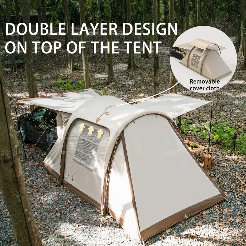 Die innovativen MKCAMP-Zelte sind mit aufblasbaren Säulen anstelle der traditionellen Metallstangen ausgestattet, was den Aufbau erheblich vereinfacht. Das aufblasbare Säulendesign ermöglicht eine deutliche Reduzierung der Aufbauzeit, sodass das Zelt innerhalb weniger Minuten aufgestellt werden kann. Gleichzeitig sorgt das Design der aufblasbaren Säulen für eine erhöhte Stabilität und Windbeständigkeit des Zeltes.