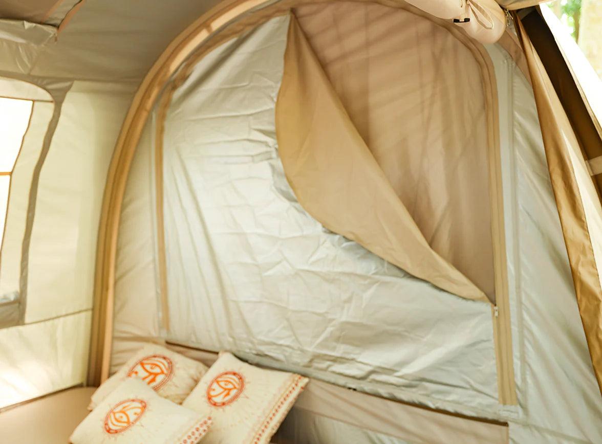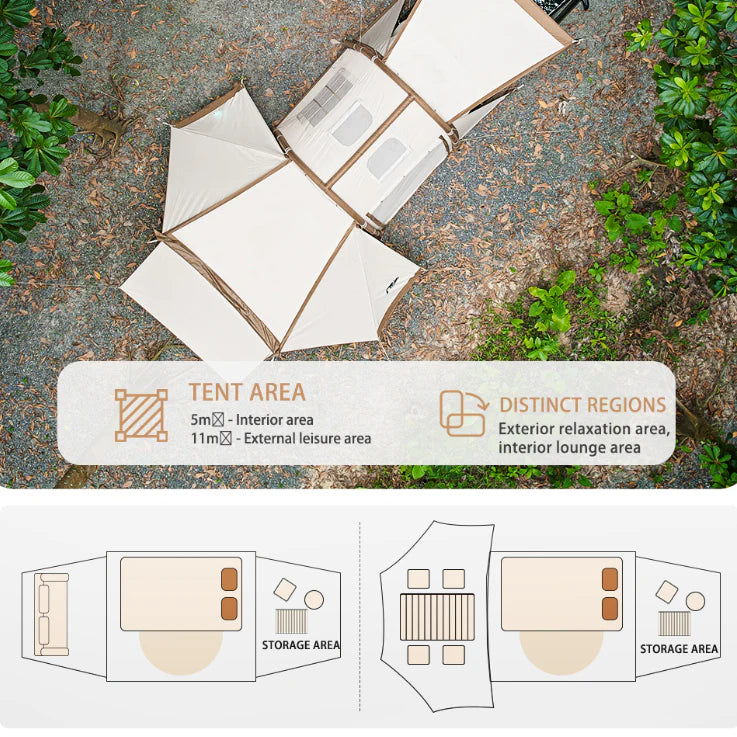 Mit dem beeindruckenden Raumangebot von 11 Quadratmetern ermöglicht das Zelt ein komfortables und stressfreies Camping-Erlebnis. Du kannst dich frei bewegen und hast genug Platz um dein Campingequipment unterzustellen.